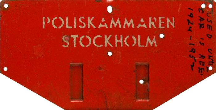 1924-1950 Backside of the dealer plate reading : POLISKAMMAREN STOCKHOLM |
