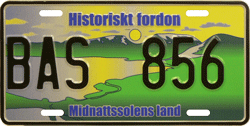 2000's Unofficial plate on older cars, mostly American models.Owner provided plates and even stickered ones were seen.These are not legal, but appearantly tolerated. Translation: "Historical Vehicle" and "The Land of the Midnight Sun". |